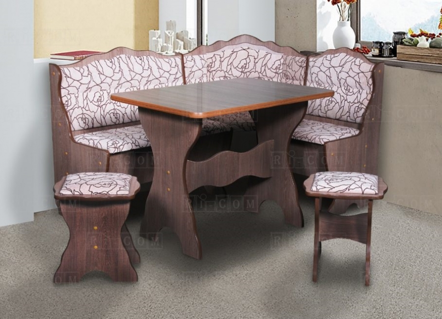 Угловой диван «Комфорт» универсален (угол взаимозаменяем). Корпус – ЛДСП 16 мм. Под откидными сидениями находится ниша для хранения. Столешница обеденного стола покрыта пластиком.