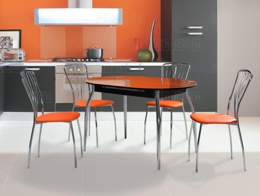 Столешница изготовлена из закаленного стекла, толщиной 4 мм. Есть возможность выбрать различные варианты изогнутых ног, цвета стекла, ЛДСП и обивки стульев (5 ценовых категорий тканей).