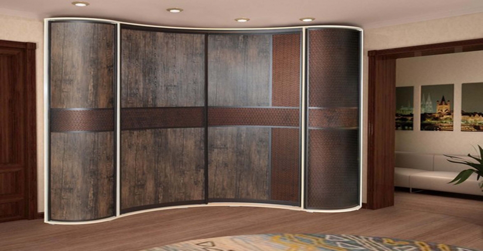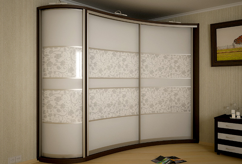 Двери в радиусных шкафах декорируются пластиком, искусственной кожей, акриловым разноцветным стеклом. Можно выбрать модель радиусного шкафа с дверцами украшенными фотопечатью.